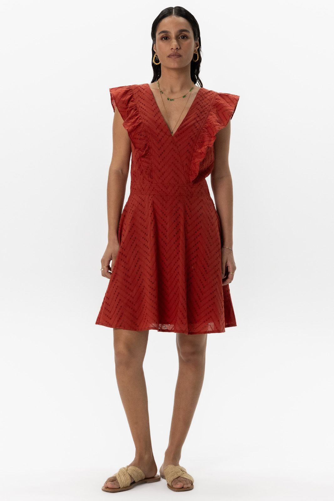 Donkerrode jurk met broderie en ruffles