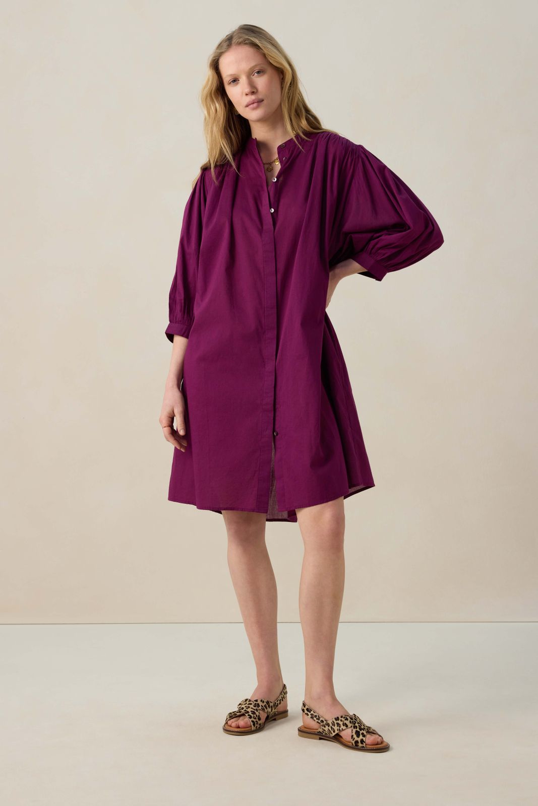 Donkerpaarse jurk met ceintuur